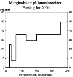 I tabell 1.1 er det gitt en oversikt over provenyvirkningene av Regjeringens skatteforslag for 2004. De provenyanslagene som gis for forslag til endringer, er regnet i forhold til referansesystemet for 2004 (se forklaring i avsnitt 1.3). Tabell 2.1 viser forslaget til skattesatser og beløpsgrenser for 2004. Til sammenlikning viser tabellen også reglene for 2003 og endring i prosent fra 2003 til 2004. Den prosentvise oppjusteringen av de generelle fradragene og beløpsgrensene fra 2003 til 2004 kan avvike noe fra den anslåtte lønnsveksten som følge av avrundinger. For øvrig vises det til utkast til skattevedtak i denne proposisjonen.
