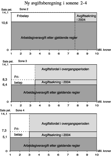 Tabell 2.6 gir et eksempel på hvordan avgiften vil bli beregnet i sonene 2-4 i 2004. I eksemplet på den nye avgiftsberegningen er det beregningsteknisk lagt til grunn at det avgiftspliktige lønnsgrunnlaget i foretaket utgjør 10 mill. kroner, at de ansatte er bosatt i samme arbeidsgiveravgiftssone, og at ingen av arbeidstakerne er eldre enn 62 år. I eksemplet er det ikke tatt hensyn til at disse foretakene også kan ha nytte av den direkte transportstøtteordningen, de næringsrettede utviklingstiltakene eller lettelsene i el-avgiften.