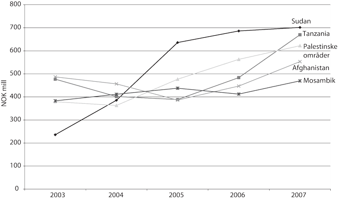 Figur 8.1 De fem største mottakerlandene av norsk bilateral bistand 2003 – 2007. For en bredere oversikt over fordelingen av støtten til de 25 største mottakerlandene i 2007, se Vedlegg 2