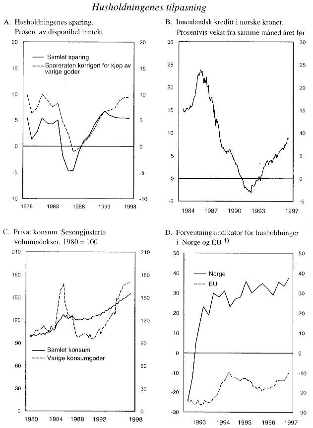 Også oppgangen i den innenlandske etterspørselen fortsetter. Kjøpene av nye biler har holdt seg på et høyt nivå hittil i år, og det øvrige private forbruket har tatt seg ytterligere opp de siste månedene. Realprisene på boliger ligger an til å øke med om lag 8 pst. i inneværende år, og bankenes utlånsvekst tiltar. Innenlandsk kreditt økte med 9,5 pst. eller 92,7 mrd. kroner fra september i fjor til september i år. Det er den sterkeste veksten siden slutten av 1988, men fortsatt klart lavere enn vekstratene på midten av 1980-tallet. Det er særlig økt utlånsvekst fra private banker til bedriftene som bidrar til den kraftige kredittveksten. Veksten i husholdningenes lån er imidlertid også betydelig.