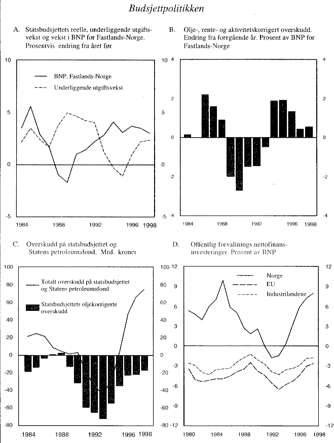 Innstrammingen i finanspolitikken i 1998, målt ved det olje-, rente- og aktivitetskorrigerte budsjettunderskuddet, svarer til om lag 1/2 pst. av BNP for Fastlands-Norge, som er 1/4 prosentenhet mindre enn i Jagland-regjeringens budsjett. Dette oppveies av forutsetningen om lavere vekst i petroleumsinvesteringene, slik at den samlede økonomiske politikken er om lag like stram som i Jagland-regjeringens opplegg.