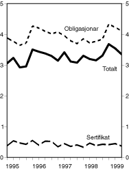 Figur 1.2 Gjennomsnittleg durasjon på norske statspapir1). 1. kvartal 1995 - 3. kvartal 1999