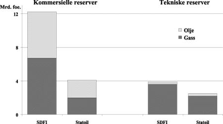 Statens portefølje av petroleumsressurser eiet direkte eller gjennom Statoil omfatter olje og gassreserver, leteområder og infrastruktur. Pareto anslår at disse ressursene omfatter mer enn 16 mrd. foe kommersielle reserver, med ca. 25% eiet gjennom Statoil og ca. 75% eiet direkte gjennom SDØE. Porteføljen omfatter videre ca. 6 mrd. foe tekniske reserver, hvorav omtrent 40% eies gjennom Statoil og 60% eies direkte gjennom SDØE. Se figur 7.1.