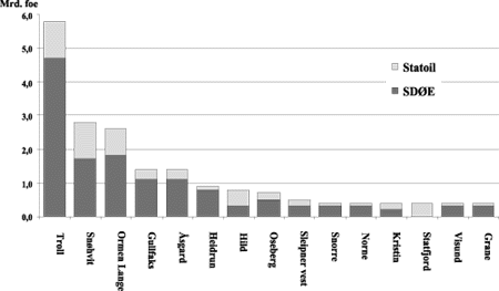 Figur 7.2 viser vårt anslag på fordelingen av reservene mellom SDØE og Statoil på feltbasis. SDØE er en betydelig eier av kommersiell gass gjennom felt som Troll og Åsgard, men også Snøhvit (under evaluering) og Ormen lange (nytt funn). Videre bør det påpekes at SDØE ikke har noen eierinteresser i Statfjordfeltet eller i Statpipe. Vårt anslag på fordelingen av de statlige eierandelene i transportsystemene fremgår av figur 7.3.
