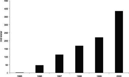 Naturgass vil gradvis komme til å spille en viktigere rolle i den norske petroleumsvirksomheten. Produksjon av gass utgjør i dag om lag 20 prosent av den totale petroleumsproduksjonen. Andelen vil øke de kommende årene. Gassvirksomheten er inne i en periode med rask oppbygging. Inngåtte langsiktige gassalgsforpliktelser øker fra om lag 55 mrd. Sm3 i 2000 til om lag 70 mrd. Sm3 i 2004, jf. figur 3.5. Eventuelle nye salg vil øke eksportvolumene ytterligere. Det er gjort betydelige investeringer innenfor gassvirksomheten på norsk kontinentalsokkel og det er inngått langsiktige gassalgsavtaler som forventes å gi salgsinntekter i området 800-1000 mrd. kroner.