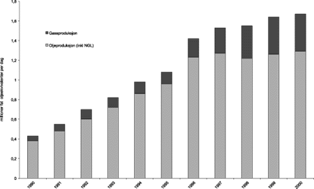 SDØEs oljeproduksjon økte jevnt fra etableringen i 1985 og fram til 1996. De siste årene har den vært forholdsvis stabil. Gassproduksjonen var lav fram til 1996, men har gradvis økt de siste årene. I figur 6.1 er SDØEs olje- og gassproduksjon for år 2000 basert på en prognose for inneværende år, jf. St.prp. nr. 19 (2000-2001).