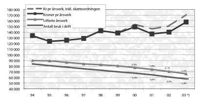 Figur 3.1 viser vederlag til arbeid og egenkapital pr. årsverk etter normaliserte regnskaper i Totalkalkylen. Totalkalkylen gjøres opp før skatt. Fra og med inntektsåret 2000 ble det innført et skattefradrag for jordbruket, og dette kommer ikke inn i Budsjettnemndas beregninger. Jordbruksfradraget ble utvidet i 2002 til et inntektsavhengig fradrag. Inntektsvirkningen av jordbruksfradraget er lagt til i figur 3.1 og tabell 3.7. Det er regnet med en inntektsvirkning pr. årsverk på 4 300 kroner i 2000, 8 900 kroner i 2001, 10 900 kroner i 2002 og 13 200 kroner i 2003. Tabellen viser en stabil nedadgående trend i arbeidsforbruket i jordbruket og i antall bruk. Inntektsutviklingen i perioden må ses i sammenheng med denne effektiviseringen i jordbruket.