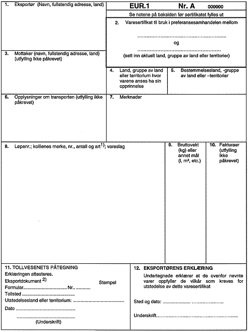 Produktenes opprinnelse skal angis (det er tillatt å benytte ISO-Alpha-2 koder). Det kan eventuelt refereres til en særskilt kolonne i fakturaen hvor opprinnelseslandet for hvert produkt blir oppgitt.