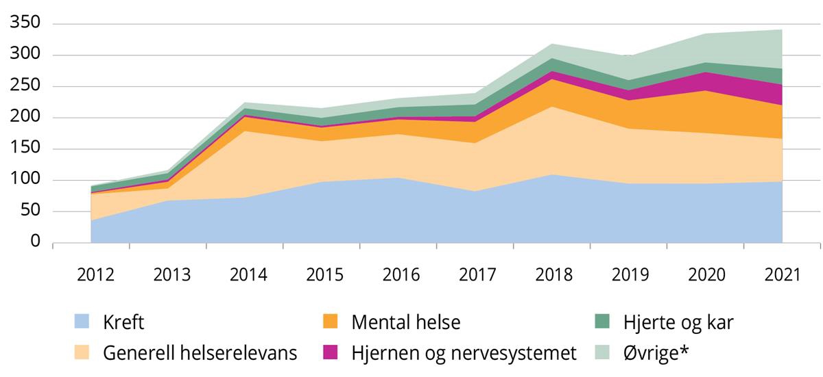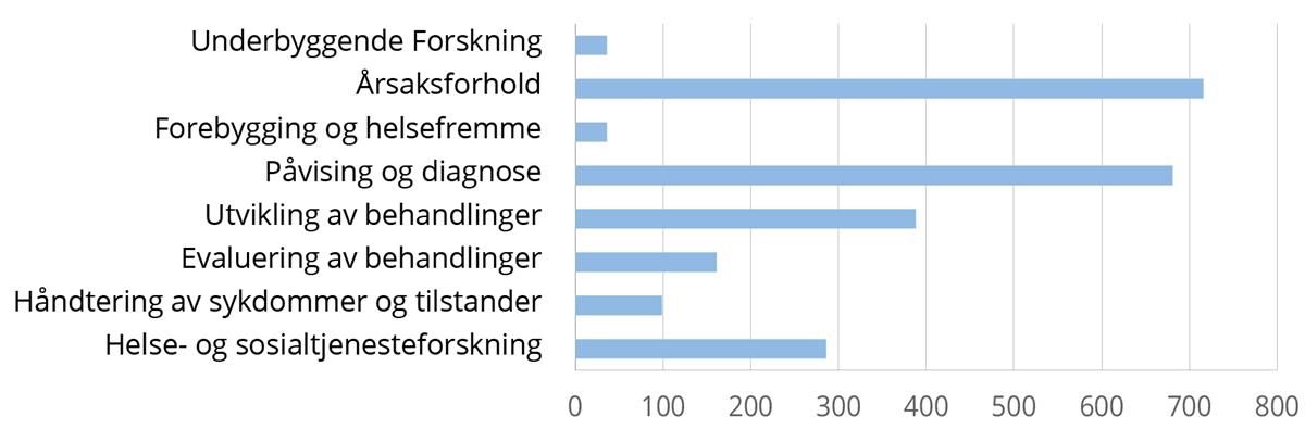Det har vært en betydelig økning i forskning og innovasjon innenfor persontilpasset medisin siden 2017 og forskningen dekker i dag en rekke forskningsaktiviteter og sykdomsområder (figur 2A og 2B). Norges forskningsråd har tildelt om lag 3,1 mrd. kroner til 305 prosjekter med relevans for persontilpasset medisin. En betydelig andel har gått til infrastruktur og store sentre som har persontilpasset medisin som et av sine satsnings- eller bruksområder. Nasjonalt veikart for forskningsinfrastruktur har lagt til rette for investeringer i infrastruktur som brukes på tvers av forskning og klinisk rutine. Sentral forskningsinfrastruktur for persontilpasset medisin er blant annet infrastruktur for bioinformatikk (Elixir), tungregning (Sigma2), biobank (Biobank Norge) og genomsekvensering (NorSeq). I tillegg er det finansiert store fyrtårnprosjekter med mål om å utvikle stordataløsninger for persontilpasset medisin (BIGMED) og digital patologi (DoMore!). Program for klinisk behandlingsforskning i spesialisthelsetjenesten og private finansieringskilder av forskning har også finansiert forskningsprosjekter og senterordninger innenfor persontilpasset medisin.