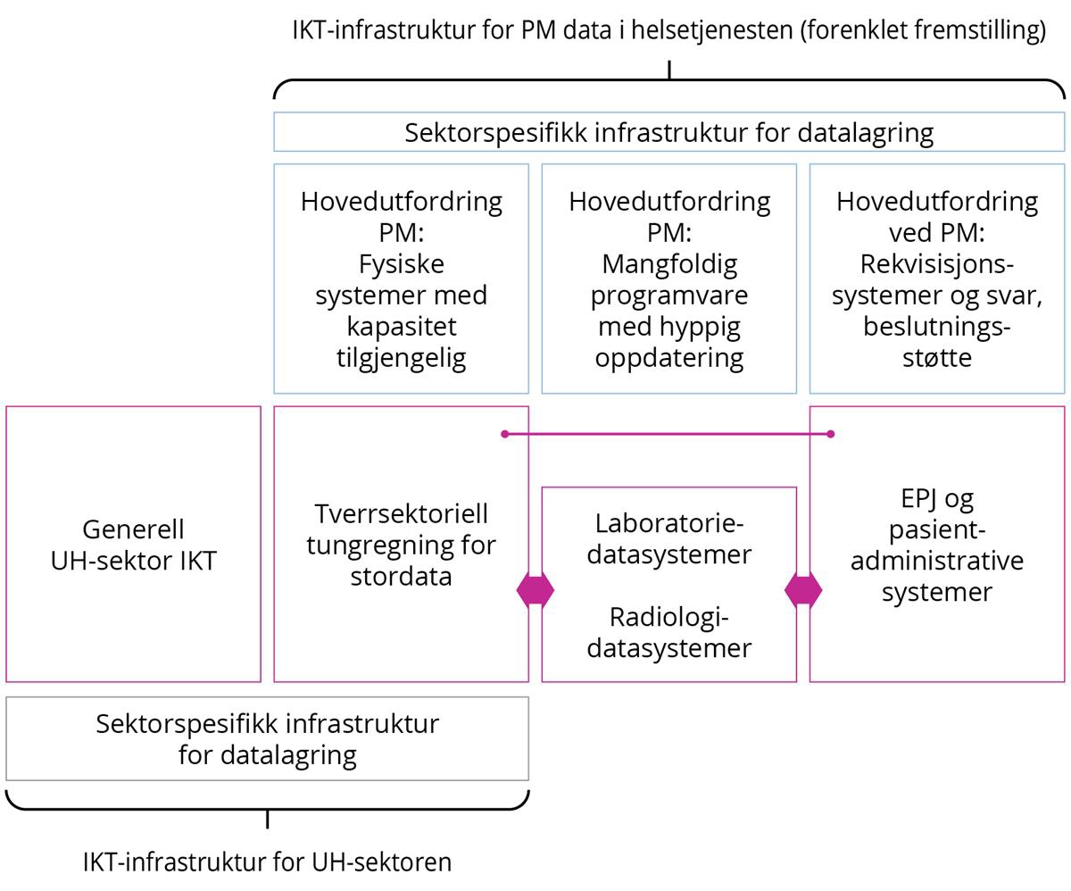 Figur 4: Forenklet fremstilling av ut i dring ved er relatert til IKT-infrastruktur innenfor persontilpasset medisin (PM) og grenseflaten mellom ulike systemtyper og mellom helsetjenesten og universitets- og høyskolesektoren.