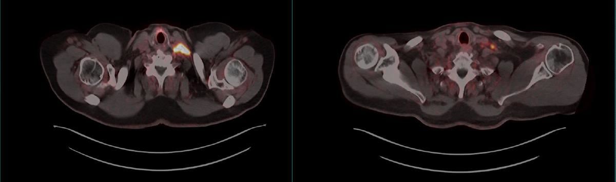 PET-avbildning med 68Ga-PSMA avdekker prostatakreft. Venstre bilde: Lysende område i halsregion hvor 68Ga-PSMA har bundet seg til PSMA-reseptorer på kreftceller fra metastaserende prostatekreft. Høyre bilde: Pasienten har gjennomgått teranostisk behandling (177Lu-PSMA) og ny PET-avbildning viser at tumor er betydelig redusert.