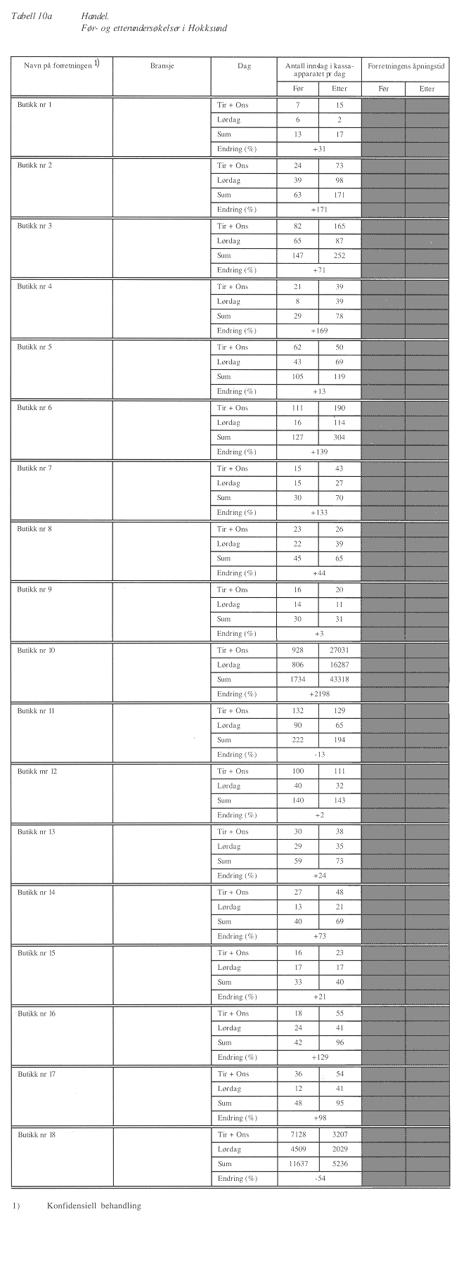 Vedlegg 1 Før- og ettermålinger av kassainnslag i Hokksund-butikkene (Obs: i GIF-format, 106 kb) Kilde: Buskerud Vegkontor Sammendrag og konklusjoner1.1 Fellestrekk1.1.1 Vanskelig å fastslå årsaker til endringDet er vanskelig å kategorisk slå fast hva som er ringvirkninger av TON- og MPG-prosjektene og hva som skyldes andre forhold. På bakgrunn av denne analysen er det likevel mulig å hente ut en del konturer av trender, konklusjoner og fellestrekk for utviklingen og resultatene i Hommelvik og Hokksund. 1.1.2 Statlig engasjement har vært avgjørendeVerdien av statlig engasjement kan oppsummeres som følger: