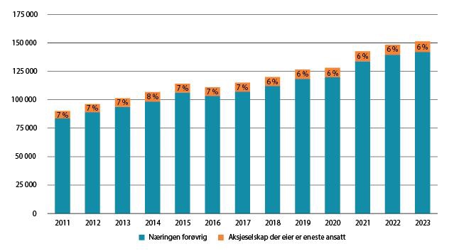 Det har de siste årene vært en vekst i antall aksjeselskap der eier er eneste ansatt, og i 2023 var det om lag 9 100 slike registrerte selskaper. Andelen av disse selskapene sammenliknet med rådgivernæringen for øvrig har imidlertid holdt seg relativt stabil siden 2011, på mellom seks og åtte prosent.