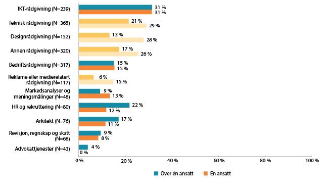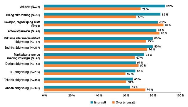 Også blant virksomheter som oftest bruker entreprise/selvstendige oppdrag, er andelen entrepriseoppdrag/selvstendig oppdrag lavest innen bransjene IKT-rådgivning og teknisk rådgivning. For virksomheter innen IKT-rådgivning med én ansatt er andelen 67 prosent, og for virksomheter med mer enn én ansatt er andelen 60 prosent. Tilsvarende for teknisk rådgivning er 65 prosent og 60 prosent.