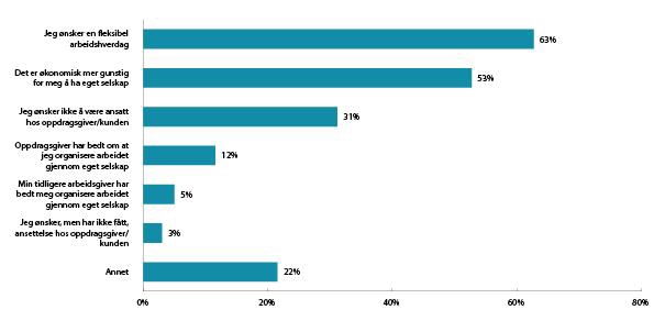Figur 3.4 viser en oversikt over årsaker til at selvstendige næringsdrivende (aksjeselskap med eier som eneste ansatt eller enkeltpersonforetak) organiserer sitt arbeid på denne måten. Tre prosent av de spurte selvstendige næringsdrivende i Menons undersøkelse svarer at de ønsker, men ikke har fått, ansettelse hos oppdragsgiver. Det er fem prosent som svarer at tidligere arbeidsgiver har bedt dem om å organisere arbeidet gjennom eget selskap, mens tolv prosent svarer at oppdragsgiver har bedt om det samme. Hvorvidt den selvstendige opplever det som problematisk å bli bedt om å organisere seg som eget selskap, fremkommer ikke av rapporten.