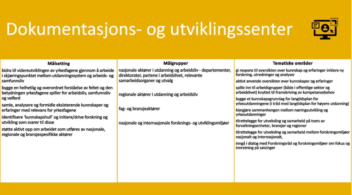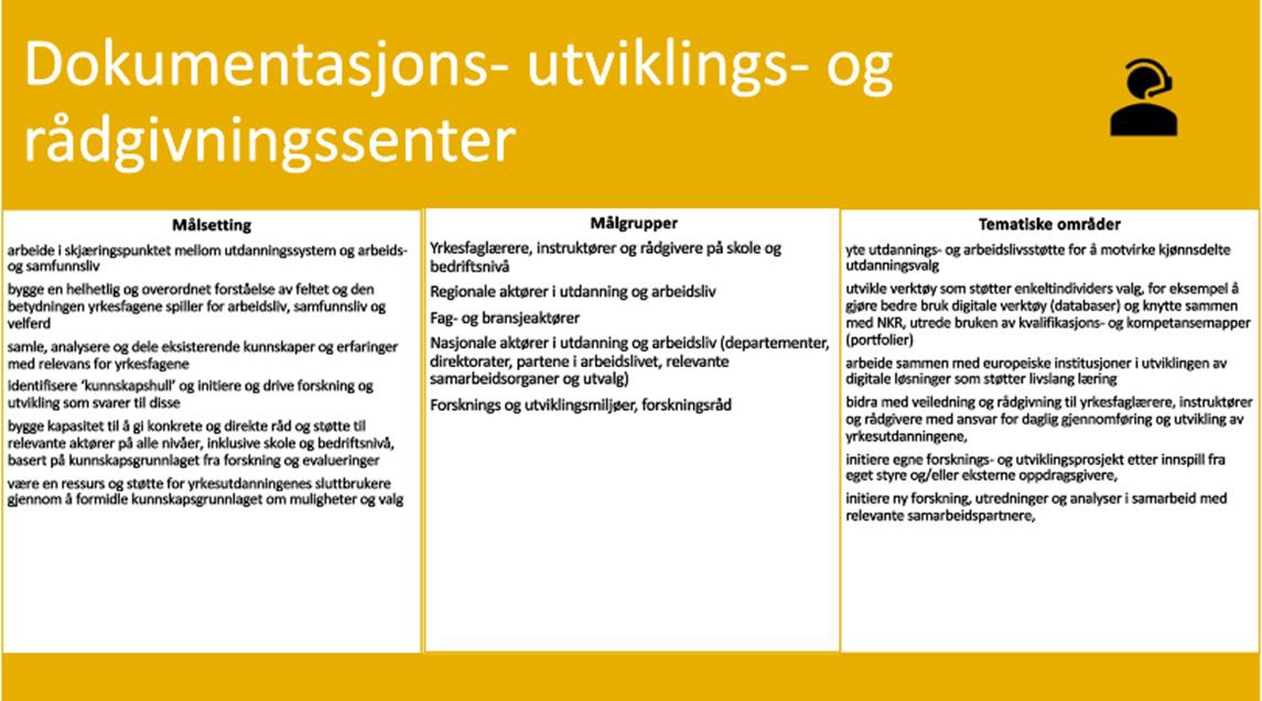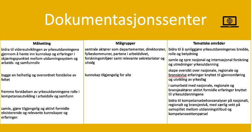 Senteret skal drive systematisk innhenting og formidling av eksisterende kunnskaper og erfaringer, fra nasjonale og internasjonale kilder, med relevans for yrkesutdanningsfeltet i Norge. Kunnskapsdokumentasjon og kunnskapsformidling står derfor i sentrum for virksomheten. Senteret skal gjennom sitt arbeid bygge en nasjonal kunnskaps- og erfaringsressurs fritt tilgjengelig for alle aktører. Senteret vil ikke ha kapasitet til egen forskning, eget utviklingsarbeid eller direkte rådgivning på skole, bedrifts-/virksomhetsnivå eller individnivå.