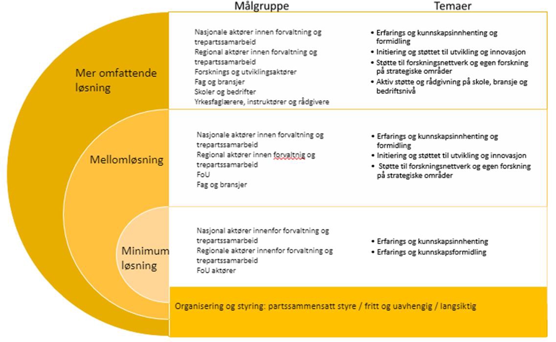 I mandatet for utredningen legges det til grunn at dagens roller og ansvarsdeling knyttet til myndighetsoppgaver på ulike nivåer ligger fast. De beskrevne alternativene danner imidlertid utgangspunkt for en refleksjon omkring hvordan et senter kan bidra til bedre samordning og koordinering innenfor disse gitte rammene – i et samspill med staten, fylkeskommunene og partene i arbeidslivet, offentlig sektor og næringslivet.