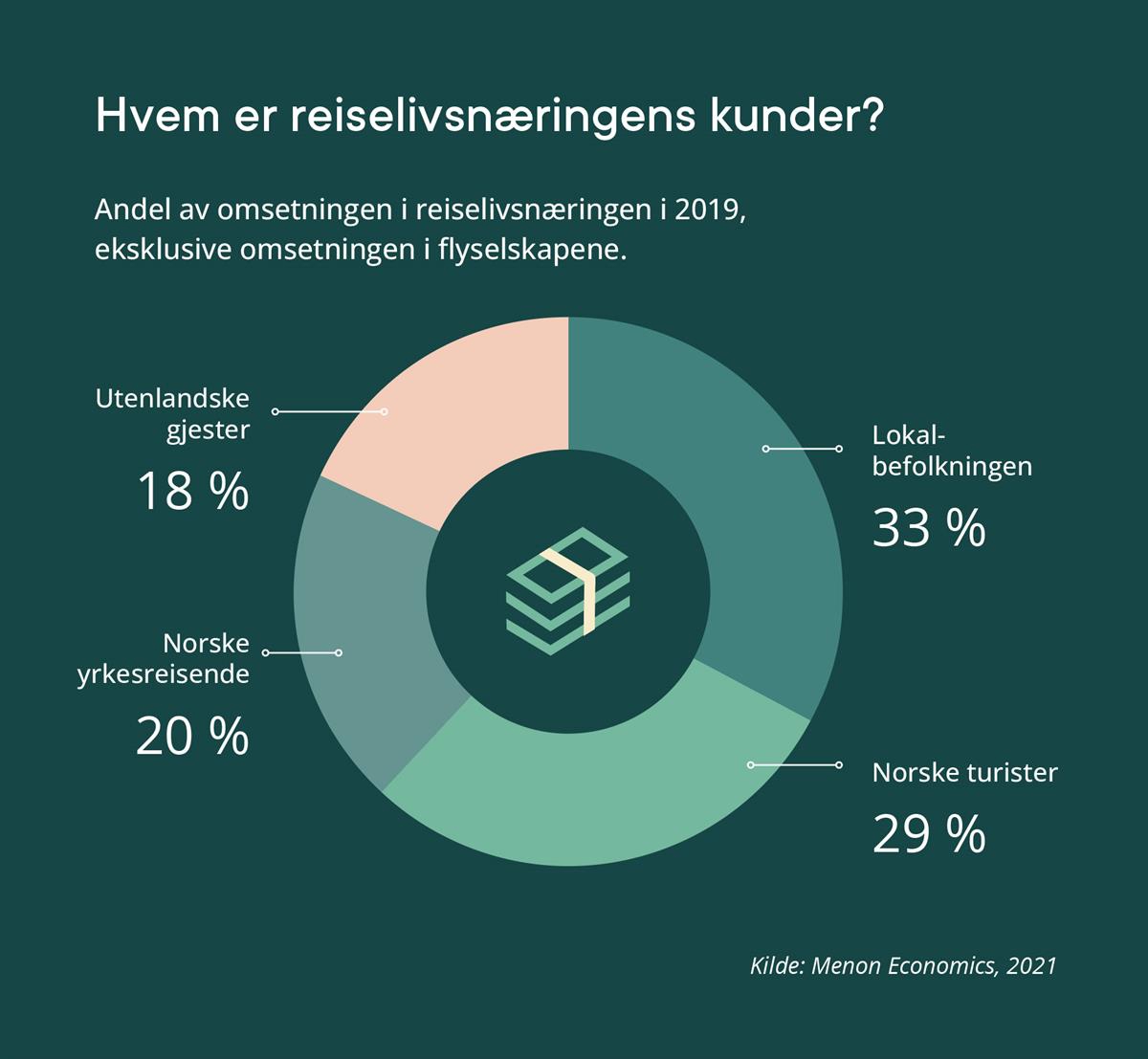 Reiselivsnæringen har ulike kategorier kunder, som her er delt inn i fire grupper; lokalbefolkning, norske yrkesreisende, norske fritidsreisende, og besøkende fra utlandet. Norske kunder – definert som bosatte i Norge – står for 82 prosent av omsetningen.
