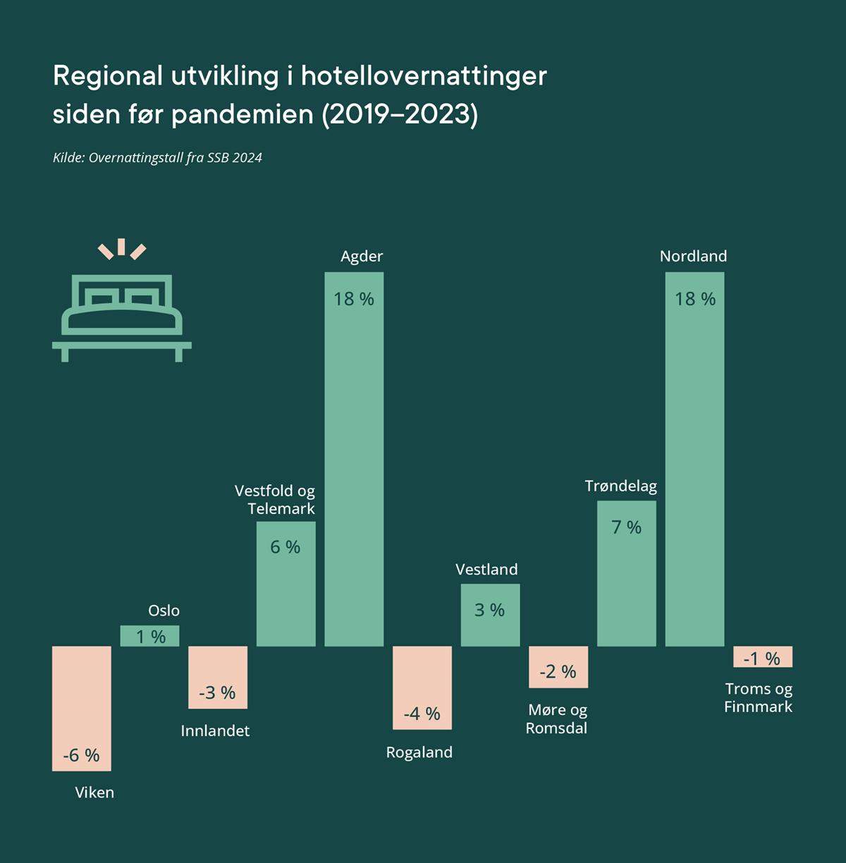 Regional utvikling i hotellovernattinger siden før pandemien (2019–2023)