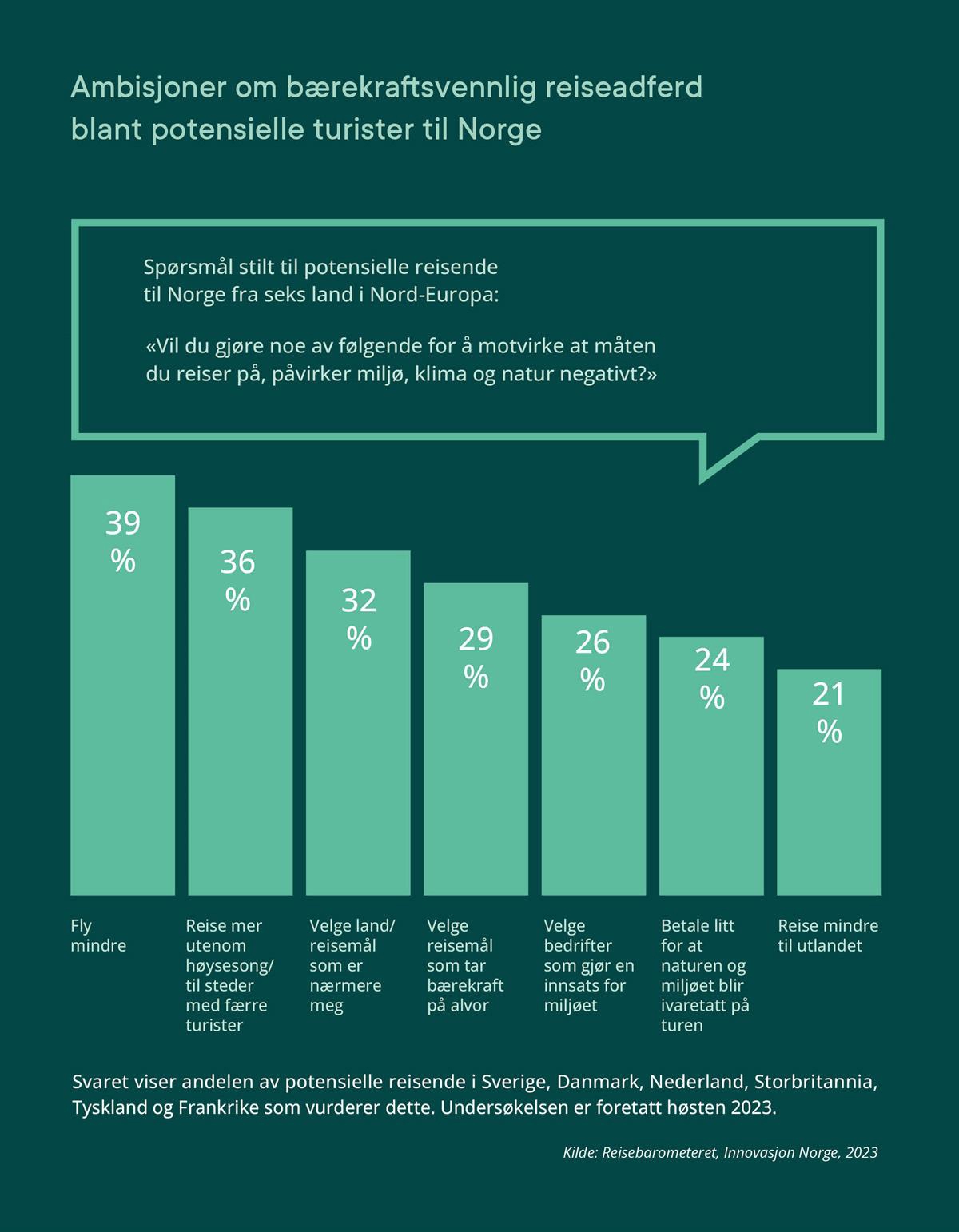 Flere indikatorer tyder på at reiselivsaktiviteten i Norge nå har passert før-pandemi-nivå i de fleste regioner og bransjer. Samlet sett ble det i 2023 registrert klart flere overnattingsdøgn for både norske og utenlandske gjester enn i 2019. Det er gode nyheter i lys av at reiseplaner påvirkes av både dyrtid, geopolitisk ustabilitet og mer ekstremvær. Samtidig var det fortsatt færre tog- og flypassasjerer enn i 2019. Antall reisende på Avinors lufthavner høsten 2023 var på om lag 90 prosent av nivået før pandemien, hovedsakelig som følge av færre forretningsreisende. Antall togpassasjerer er stigende, og ventes å øke ytterligere som følge av flere avganger fra desember 2023, blant annet på strekningene Oslo-Gøteborg og Oslo-Bergen (ifølge Vy). Cruisetrafikken i norske havner økte videre i 2023, med omtrent 45 prosent fra året før. Norge ble særlig attraktivt for cruise som følge av at rederiene unngikk Østersjøen (Kystverket, 2024).