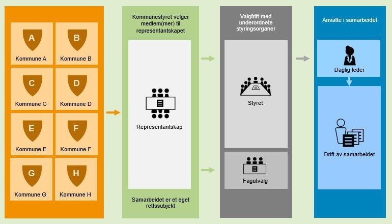Deltakerkommunene har stor frihet til å bestemme selv hvordan samarbeidet skal innrettes, og hvordan ansvar og oppgaver skal fordeles. Et hovedskille går mellom samarbeid som er eget rettssubjekt og samarbeid som ikke er eget rettssubjekt. I tillegg kan deltakerkommunene langt på vei selv bestemme hvordan samarbeidet skal organiseres, om det for eksempel skal være ulike arbeidsutvalg, et styre og/eller en daglig leder. Her beskriver vi noen muligheter innenfor regelverket. Beskrivelsen er ikke uttømmende.