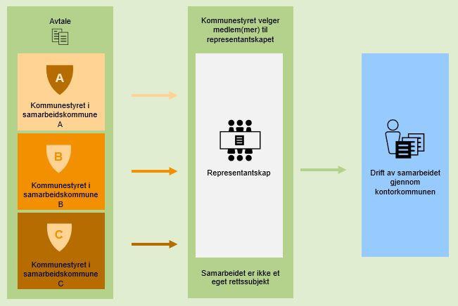 Begrepet kontorkommune brukes om den deltakerkommunen som avgir ressurser til samarbeidet og i hovedsak står rettslig og økonomisk ansvarlig for eventuelle kontrakter som inngås.32 Begrepetbrukes først og fremst i samarbeid som ikke er et eget rettssubjekt, se kapittel 6.5.6 om eget rettssubjekt. I samarbeid som er et eget rettssubjekt, er det ikke nødvendig å ha en kontorkommune, ettersom samarbeidet selv kan inngå kontrakter, ansette personell, osv. Da er alle kommunene deltakerkommuner.
