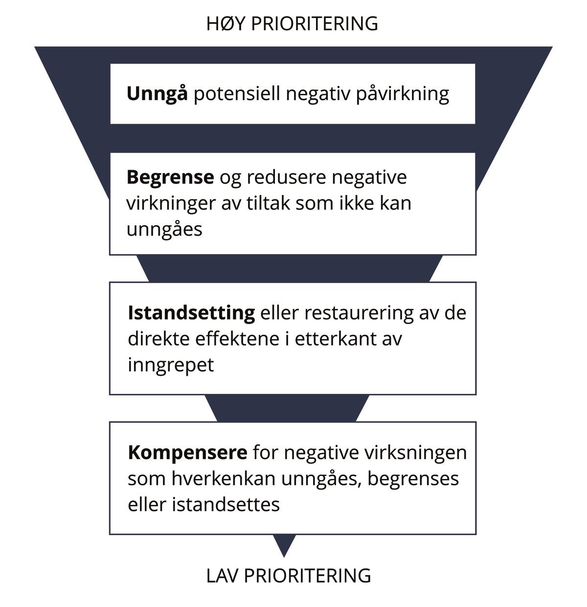 Figur 6.1 Hierarkisk framstilling av tiltak for å unngå negativ påvirkning ved utbyggingsprosjekter. Figuren illustrerer at størst gevinst oppnås ved å unngå, deretter begrense eller istandsette – og kompensasjon som siste utvei. (ref: rapporten «Fysisk kompensasjon for jordbruks- og naturområder ved samferdselsutbygging», Samferdselsdepartementet 2013).
