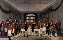 17. mai vedtok riksforsamlingen grunnloven og valgte prins Christian Frederik til Norges konge. 19. mai aksepterte Christian Frederik kongevalget og avla ed på Grunnloven. Riksforsamlingsrepresentant Jacob Aall skriver i sine erindringer dette om prinsens følge under edsavleggelsen: