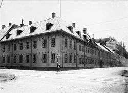 I mars 1814 fikk de første departementene sine kontorer i Generalitetsgården, på hjørnet Dronningens gate/ Prinsens gate. I venstre bildekant Katedralskolens gård i Dronningens gate 15. (Foto ca. 1900: Anders B. Wilse/Oslo Museum).