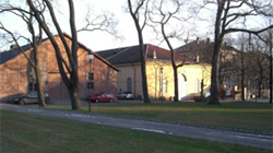 Kommandantboligen på Akershus festning lå i 1814 på nordsiden av Festningsplassen, i området bak det som siden 1840-årene er Den militære kontorbygning i Myntgaten - omtrent der Det nye ridehus (til venstre) nå ligger. (Foto: SMK)