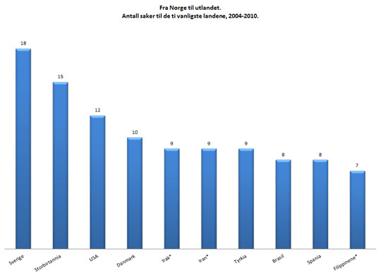 I de fleste barnebortføringssaker fra Norge til utlandet i perioden 2004-2010 ble barnet bortført til Sverige (18), deretter fulgte Storbritannia (15), USA (12), Danmark (10), Iran* (9), Irak* (9), Tyrkia (9), Brasil (8), Spania (8) og Filippinene* (7). Der barnet ble bortført fra utlandet til Norge ble de fleste bortført fra USA (19), deretter fulgte Sverige (14), Danmark (12), Storbritannia (8), Nederland (7), Spania (6), Tyskland (6) og Litauen (4).