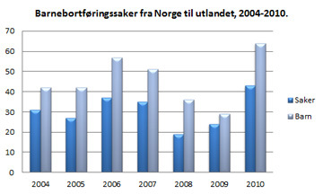 Antallet barnebortføringer fra Norge til utlandet økte fra 24 (29 barn) i 2009 til 43 (64 barn) i 2010. Dette tilsvarer en økning på 79 prosent i antall saker. Det ser derfor dessverre ut til at nedgangen i 2008 og 2009 var forbigående og at vi nå er tilbake på nivå med antallet barnebortføringssaker i 2006 og 2007, da vi behandlet henholdsvis 37 og 35 saker.