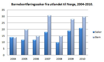 Også antallet barnebortføringssaker fra utlandet til Norge økte i 2010. Fra 19 saker (28 barn) i 2009 til 21 (30 barn) i 2010. Dette tilsvarer en økning på om lag 10 prosent i antall saker.