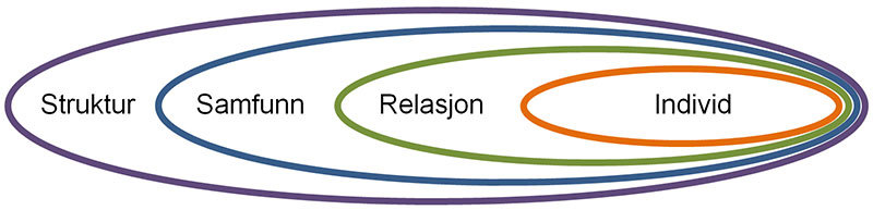 Både risiko- og beskyttelsesfaktorer finner du på alle nivåene, struktur, samfunn, relasjon og individ.