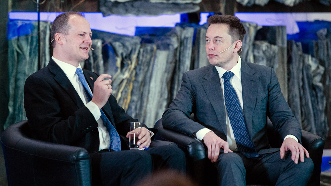 Ketil Solvik-Olsen og Elon Musk i samtale under konferansen (Foto: Scanpix/Audun Braastad)