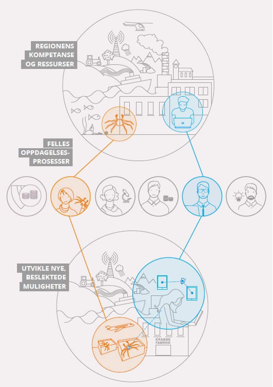 Dette er et forenklet eksempel. Illustrasjonen viser en tenkt region som har god tilgang på kongekrabber og et IT-miljø. Fylkeskommunen har laget en analyse av regionen, med vekt på muligheter og mulige koblinger mellom sterke næringer og kompetanser, og inviterer til en felles oppdagelsesprosess. Der møtes blant annet næringslivet i regionen, forskere fra universitetet, investorer, noen av regionens organisasjoner og kreative enkeltpersoner. Fylkeskommunen har også invitert stemmer utenfra regionen som stiller kritiske spørsmål underveis.