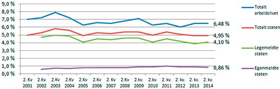 Figur 1: Legemeldt og egenmeldt sykefravær i staten og arbeidslivet totalt 2. kvartal 2001 - 2.kvartal 2014. Prosent.