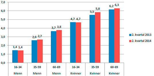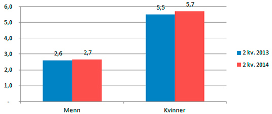 Som det går fram av figur 2, som viser legemeldt fravær, har kvinner høyere sykefravær enn menn i staten. Det er også kvinnene som står for den største økningen fra 2. kvartal 2013 til 2. kvartal 2014.