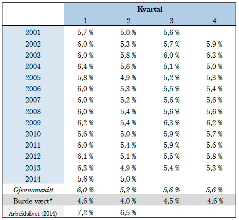 | Olje- og energidep. | 2,6 | 2,4 | 4,4 | 2,9 | 2,7 | 3,1 | 2,3 | 2,9 | 4,2 | 3,1 | 2,1 | 3,2 | 6,6 | 4,3 |