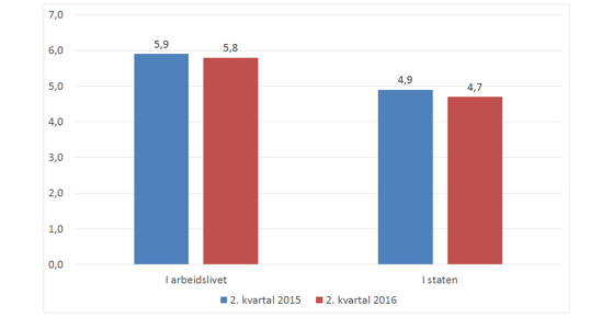 Andel arbeidstakere med legemeldt sykefravær for 2. kvartal 2016 i staten er 4,7 prosent. Det er en liten nedgang i forhold til 2. kvartal 2015. I arbeidslivet sett under ett er sykefraværet i 2. kvartal 2016 på 5,8 prosent.