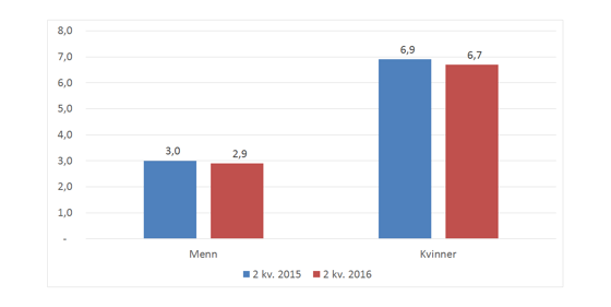 Figur 2: Legemeldt sykefravær 2. kvartal 2015 og 2016 blant kvinner og menn i staten. Prosent.