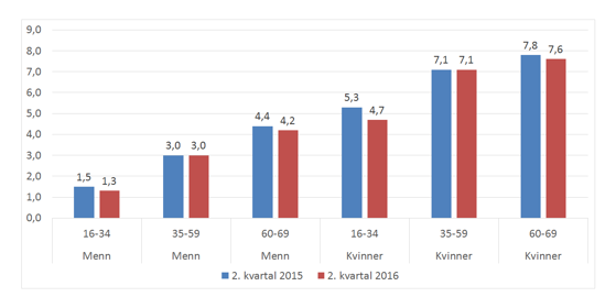 Figuren nedenfor viser hvordan det legemeldte sykefraværet betinges av kjønn og alder. Vi ser at sykefraværet i 2. kvartal viser en liten nedgang blant menn og blant kvinner i aldersgruppen 16-34 år og 60-69 år.
