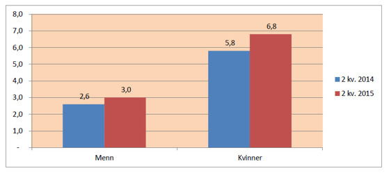 Figur 2: Legemeldt sykefravær 2. kvartal 2014 og 2015 blant kvinner og menn i staten. Prosent.