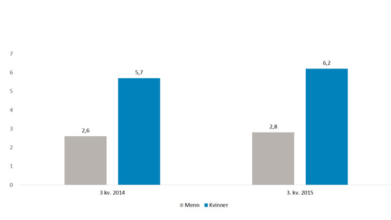 Figur 2: Legemeldt sykefravær 3. kvartal 2014 og 2015 blant kvinner og menn i staten. Prosent