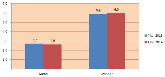 Som det går fram av figur 2, som viser legemeldt sykefravær, har kvinner klart høyere sykefravær enn menn. Vi ser at sykefraværet blant menn går ned med 0,1 prosentpoeng i perioden. Det legemeldte fraværet for kvinner øker med 0,1 prosentpoeng fra 4. kvartal 2013 til 4. kvartal 2014.