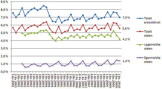 Figur 1: Legemeldt og egenmeldt sykefravær i staten og arbeidslivet totalt fra 1. kvartal 2001 til 1. kvartal 2010: