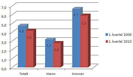 Det legemeldte sykefraværet for kvinner sank til 5,9 prosent fra 6,7 i samme kvartal 2009. Det egenmeldte fraværet for kvinner sank fra 1,8 til 1,6 prosent. For menn sank det legemeldte sykefraværet med 0,9 prosent, mens det egenmeldte sykefraværet for menn sank fra 1,21 til 1,18 prosent fra 1. kvartal 2009 til 1. kvartal i 2010.