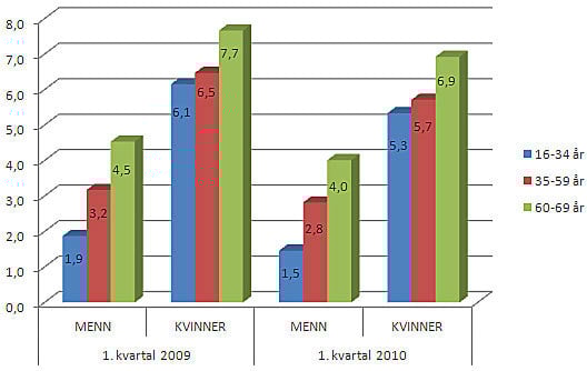 Generelt er det en tendens til at det legemeldte sykefraværet øker med alder. Figur 3 viser at kvinner i aldersgruppen 60-69 år har det høyeste sykefraværet med 6,9 prosent. Imidlertid har denne gruppa like stor nedgang som de andre kvinnene (0,8 prosentpoeng) fra 1. kvartal 2009 til 1. kvartal 2010.