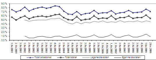 Figur 1: Legemeldt og egenmeldt sykefravær i staten og arbeidslivet totalt fra 2001 til 2. kvartal 2009: