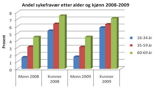 Generelt er det en tendens til at det legemeldte sykefraværet øker med alder. Av diagrammet nedenfor går det fram at det legemeldte sykefraværet for aldersgruppene 16-34 år var 3,4 prosent, en økning på 0,3 prosentpoeng. For gruppen 36 – 59 år var det stabilt på 4,6 prosent fra 2.kvartal 2008, mens det var på 5,6 prosent i aldersgruppen over 60 år, en nedgang på 0,2 prosentpoeng. Det var tilnærmet uendret for aldersgruppen 35-59 år, mens det sank med 5 prosent til 5,9 prosent i den eldste aldergruppen (60 – 69 år). Også dette er sammenlignet med 2. kvartal 2008 (se diagram).